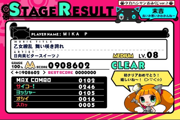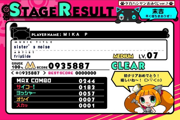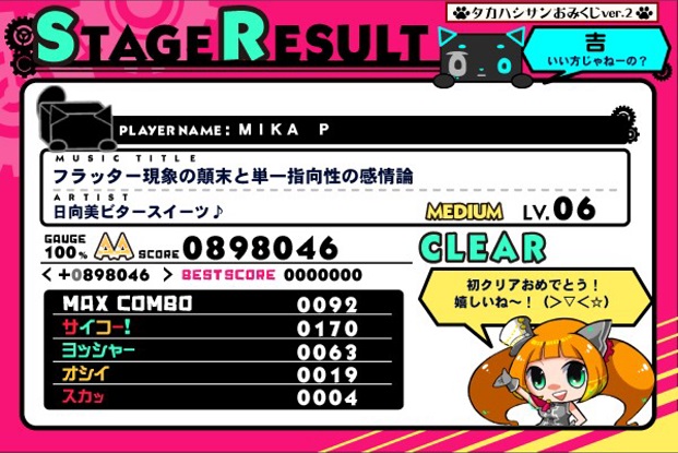 でもほかにやっているjubeatに比べると東方アレンジが圧倒的に多いというイメージ。ウサテイとかjubeatにはないしなあ。あとムービーがあるので楽しくできるのがいいところ。でもムービーに夢中になるとMISSが増える!