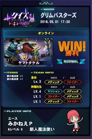 グリムバスターズは勝ちました。まだ始めたばかりなのでレベルはかなり低い。