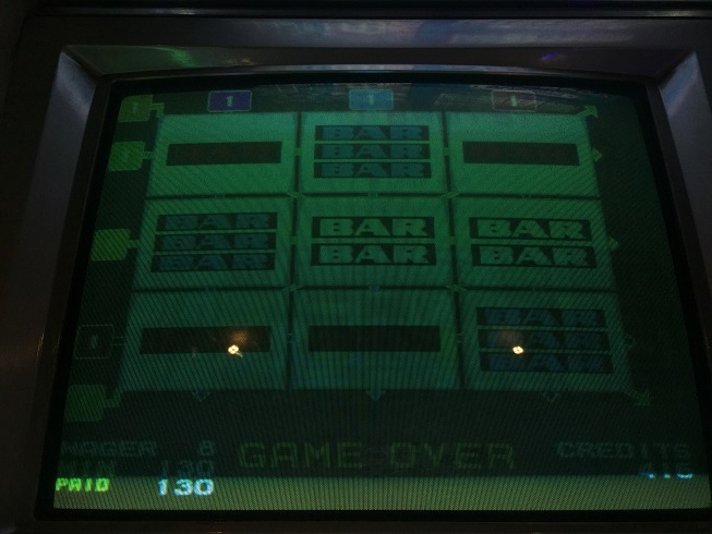 奈緒当たりは顔・8・8と顔・BAR・BARのANY3が2個という何の変哲もないいつもの当たり。が、ダブルが運良く勝ち2496まで到達。あと2回通せば9984というときにDEALERはチェリー。ここは絶対勝ってくれ!って思い叩くとなんとプラムが並んだ状態で勝ち、