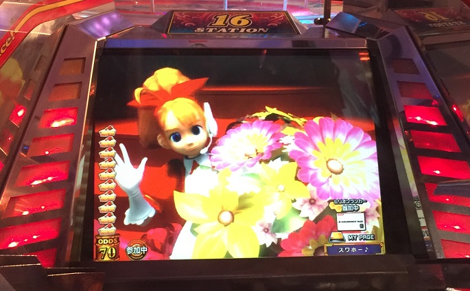 2223WIN(57倍)がフリー獲得枚数になった。まあ39BETではこの当たりなんて話にならないので当然叩く。一発目はなんとDEALERがBAR。しかし運よくPUSH!2回目はチェリーだったのでとりあえず勝ってくれと思ったらなんとプラムが揃いポケモンフラッシュ!