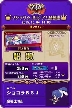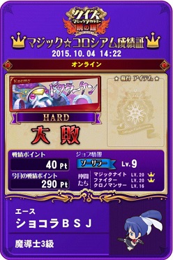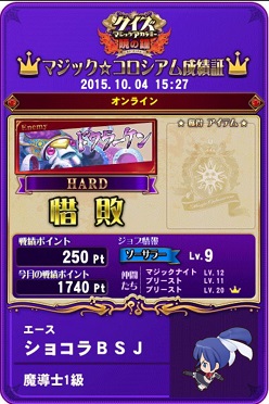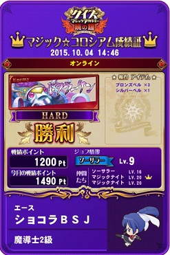 今日はメダルゲームをあまりしてなく、友人と交代でQMAをプレイ。プレイは言うまでもなくマジックコロシアムです。また、今回対戦相手が変わっていました。ドクラーケンになっていました。交代しながらも協力してプレイをしたのですが、なんとほとんど負けました…たしか友人のも含めて15回くらいして12回負けるという散々な結果に。勝ち方もぎりぎりで最後の攻撃で何とか撃破という状態に。バランス・正答率もかなりいいのにぎりぎりだったときもあるので敵のパラメーターを下方修正してほしいと願うばかりです。私のカードでは6回行いましたが5回も負けました。なんか明らかに勝ってないなあ…