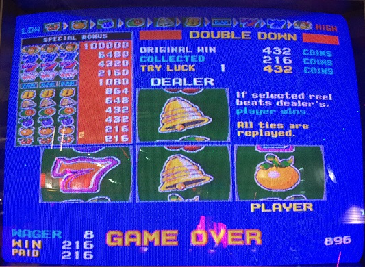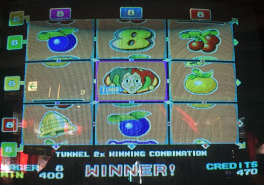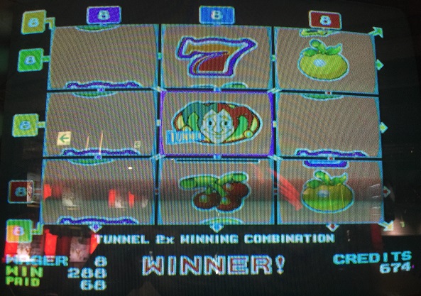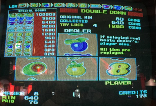 なんとJOKERが3つも来ました。すべてのANY3が加算されるため強力な手に!ベルのANY5もいいですね。ただ、JOKER2つある隣がブランクなのが悔やまれますが。608winなのでコレクト。その後も遊び、
