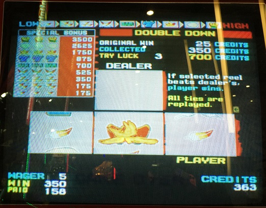 そのあとSUPER HOT SEVENSというメカスロに。ここでも777が結構来たりトリプルBARが結構並んだりして+500に。この機種で当たったのも珍しいですが。