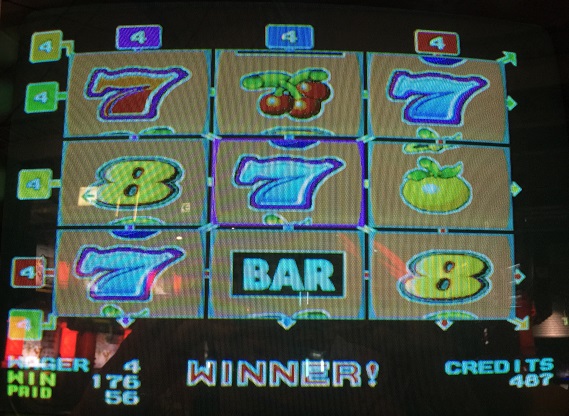 WILD無しの純粋青7揃いゲット!!ホントはダブルダウンしようと思いましたが青7揃いの写真がなかったので撮りたいがためにコレクト。8が赤or青7なら一発(4×(20+20+40+80)) 640枚かあ。この後は400枚でコレクト。さらに別のZの台へ。1BETでしていたらフリー来ました。結果的に320winになりました。