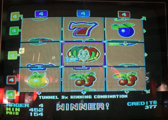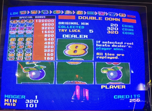 そこからハーフで結局320とどまりで終了。これもフリーの前に192win出しているので400枚でコレクトしました。というか1BETなのに先ほどの4BETと同じ枚数出るというのも変な話ですが。1BETでダブルダウンWAGER160なのでホントに運が良ければTUNNELおじさん&7という振り切り定番の組み合わせで1BET振り切りできるかもしれないですね。極めて難しいですが。
