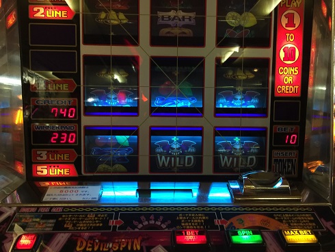 デビルスピン。ドラゴン社のマシン。これは下段に青7(×20)成立したところ。フリーは完全にボーナススピンZXと同じ。違うのはフリーの回数と倍率。こいつには×10・×20というとんでもない倍率もある。まあほぼ引けないけど。それとジャックポットを引く時もある。最高5000枚だが×20とか引いた方がとんでもないかも。