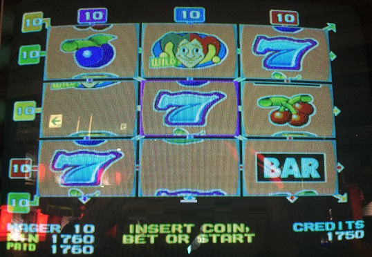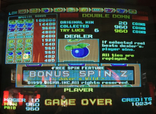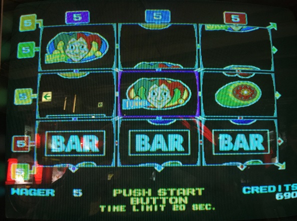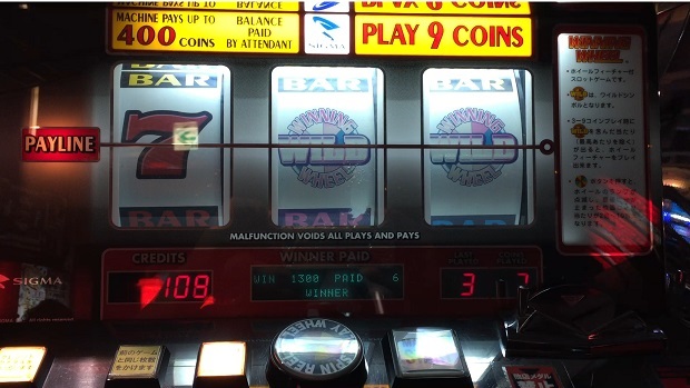 昨日勝ったので慎重にしようかと思いましたが、昨日友人がでかめのベットでしたいとのことで結局一気に勝負をしに行きました。だがまだ友人が来ていないのでメカスロでもすることに。SIGMAのWINNING WHEELをしました。まず3BETでしたらBAR・BAR・WILDでホイール3倍で60WIN。結構な頻度で当たったのでベット数を6にしようと思ったら間違えて7BETに。仕方ないと思いまわすとなんと