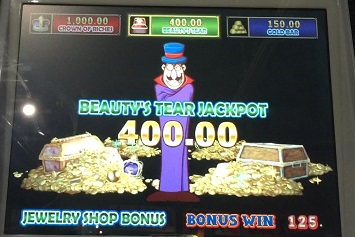 この後ARUZEのメカスロをしました。BURGLAR IN PARISです。MAX5BETでするとボーナスが増えるので当然5BETでしました。するとフィーチャーイン。それでなんとJACKPOT取れました。まさかの展開にびっくりしました。前も入ったんですが、ダメでした。怪盗のオッサンのどや顔またいいですね。やったぜ!どや!みたいで。