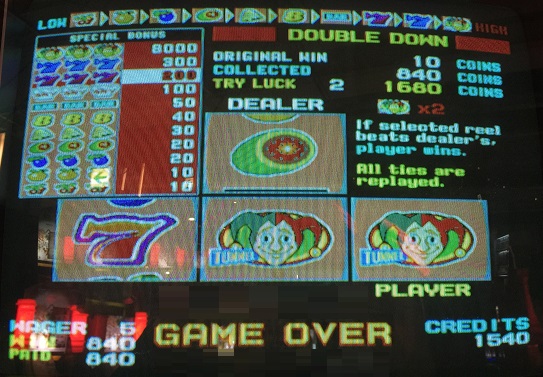 それとボーナススピンでアウチ発生。たったの10枚で赤7&TUNNELおじさん×2が来るという事態に。2倍でしたので840WIN。うれしかったですが、なんか素直に喜べないです…早すぎる特大スペシャルです。