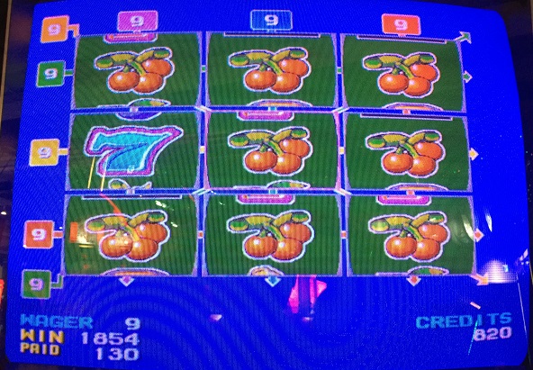 私自身初のANY8達成です!チェリーがなんと8個も来ました。200倍です。9BETだったので1854WINです。残り1つの青7から哀愁漂っています…