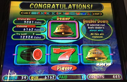 フリーゲームではマルチ×2・3ゲーム3倍といいのか悪いのやら…3081枚だったので流石にダブルダウン行使!正直ベルが出た時点で負けるかと思ったが、こちらは赤7を引いてくれたのでなんとか勝利をもぎ取る!一応ダブルダウンはまだ叩けるのだが、SIGMA振り切り(5000)目安にやっているのでここで止める。