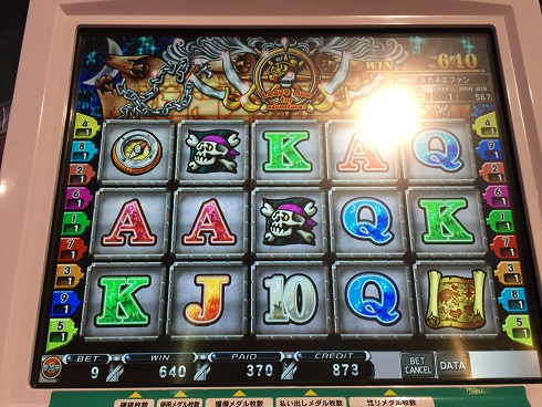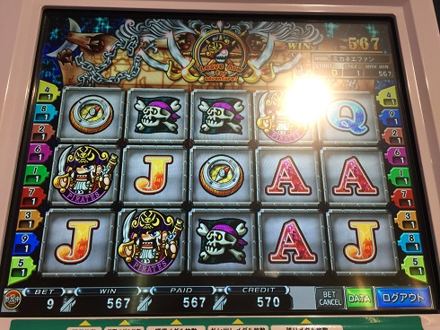 カギ4つがきて150その後海賊のおっさんが4つ来て300WIN。結局567WIN。まあいいんじゃないの。大体30倍行かんこと多いのに珍しく60倍くらいになった。