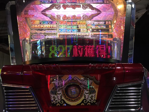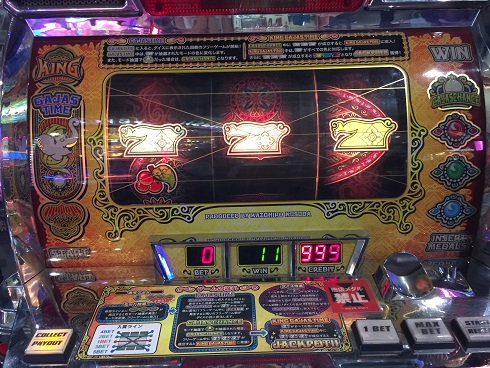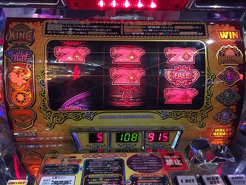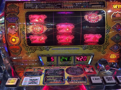 まず昨日も当たったインド風メカスロガジャスキング。なんと今日もフル稼働してくれました。開始早々フリー。ガジャスチャンスでしたが微妙な結果に。白7は揃わず。しかし2回目はすぐ来てくれました。