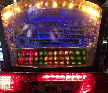 他のメカスロもやりましたがこれど当たらず。最後に彩花爛漫をしました。この時友人と他のメカスロを一緒にやっており一緒に負けていました(笑)どっちかジャックポット引き当てたら山分けという状況で行いました。友人の方は4点灯まで行きましたが惜しくも5つ目まではならず。私の方はというと、300枚消費くらいでやっと4点灯。でも全く当たらず。ですが抽選で最後の1つが点灯!ジャックポットチャンスに突入!3回目くらいで両隣白7・センターリールが逆回転しジャックポット獲得できました!4107枚です!