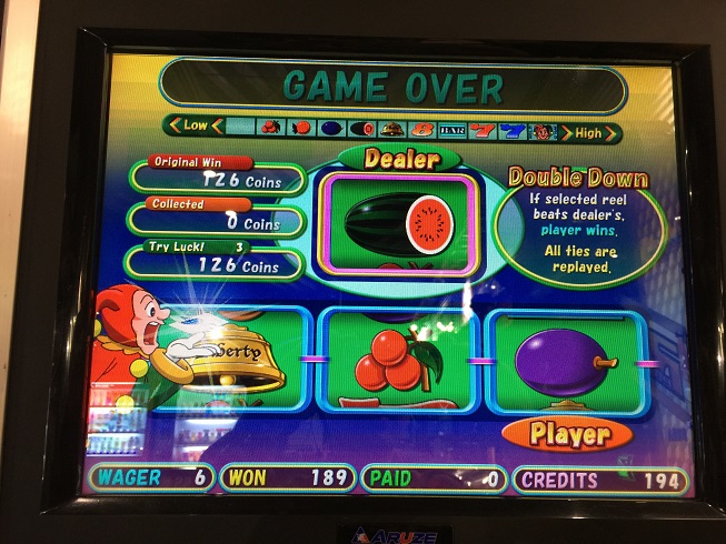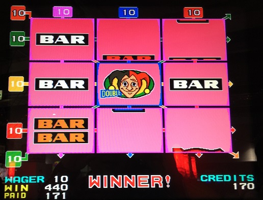 この後ツインジョーカーズもやったのですが、Aの絶不調が嘘のような展開でした。普通に200倍近くのフリーひきました。JOKERおじさんは2枚来ました。倍率は2倍。残念ながら並びませんでしたが。5BETでやった時は1枚1倍と駄目だったのでダブルダウン。なんとか勝ってまともな枚数になりました。