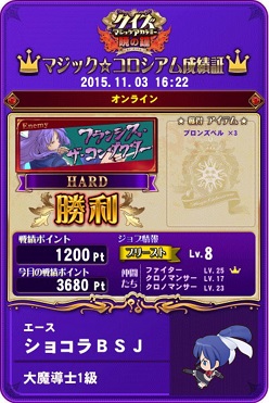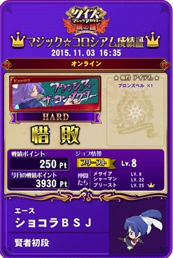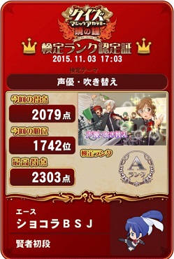 その後QMAしました。今日は1勝1敗でした。それと今日ようやくですがついに賢者に昇格しました。稼働して約7ヵ月で賢者に到達しました。遅すぎかもしれないですが。まあビデオスロットと並行しているからしょうがないですが。これでQMAの目標は達成です。あとは適当にやります(笑)それとジョブチェンジしました。ソーサラーでしたが一時的にプリーストしました。一応レベル8なのでHARD挑戦は可能です。プリーストだと回復ができるので即死はあまりなさそうですが。あと今回から声優検定あるんですね。ちょっとだけしましたが正直難しすぎます…3500なんてトップライン出すくらいの難易度ですよ…