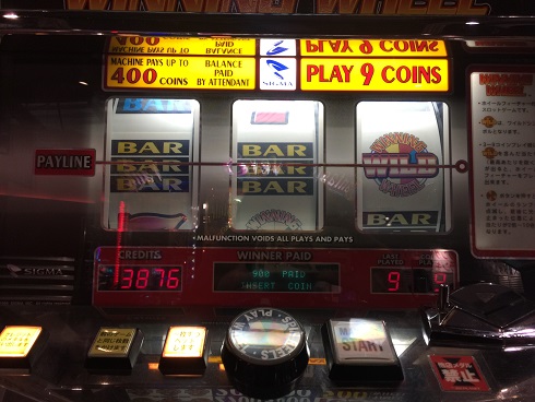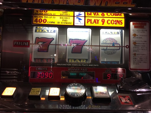 なんと3000WIN!ホイールが5倍に止まり200×3×5=3000と化する。WINNING WHEELでここまでの当たりを出したのは初。その後にはさらにTRIPLE BARがホイール付きで揃い