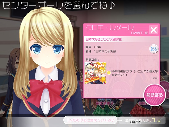 恐らくレベルが上がるとセンターが増えるためセンター効果も複数扱うことができる?とりあえず1番有名であろうクロエちゃん選択。音ゲーとしてはスクフェス同様9箇所だが、常にボタンを押す箇所が表示されているわけじゃないので表示されたところを押すという感じである。あと違うのはコンボが一定の数以上になるとミラーボールが出現して時々回してスコアを稼ぐ必要があるというのも違う。コンボが切れるとミラーボールも消滅という感じである。