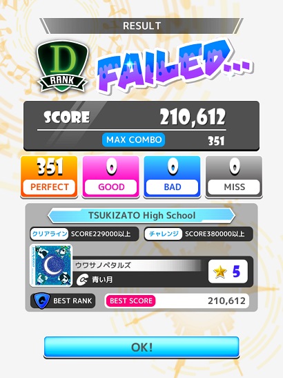 それなりに難しいレベル5(最高6)をALLPERFECTしたのに失敗って…やりたての人ならこうなるかも。