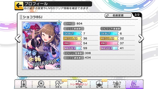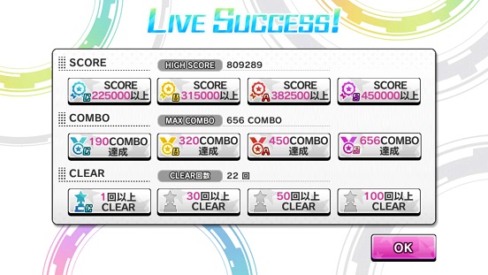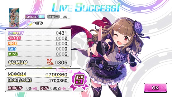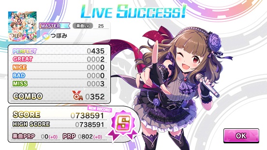 さらに更新出来た。ちなみにコンボボーナスを1人から2人に。コンボも結構つながってくれて73万に。Missはようやく5回以下になったこともあり、回復なしでも行けるように。数こなすことは大事ですよ!これで銅トロフィーは間違いないかな?