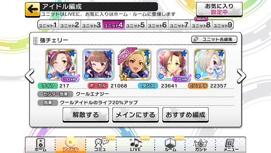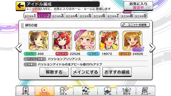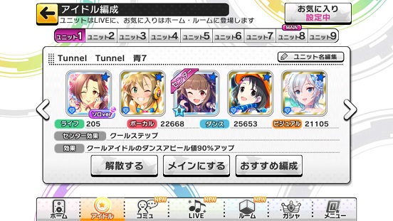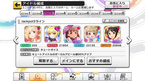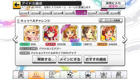 もう一つ、エンジョイユニットについて。これはMASTER+を主にするためのユニット。というわけで回復&ガード重視。なおこれに関してキュートは回復&ガードアイドルがほぼいないのでクールとパッションのみ。キュートの場合は無理やり他属性ユニットでする。