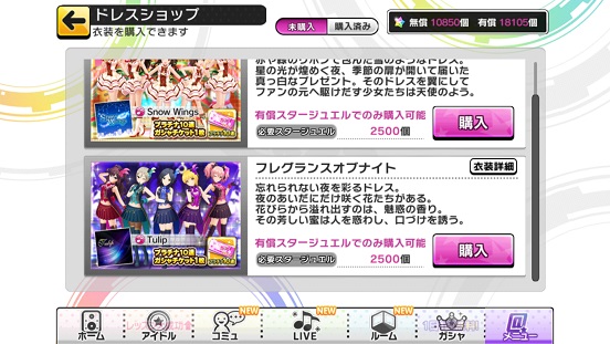 今日のダウンロードでLiPPSの衣装が発売。有償ジュエル2500で買えるのは全く同じ。しかし前回と違うのは衣装に加えプラチナガシャ10連チケットまでついてくること。つまり普段から課金している人ならスカウトチケット感覚で買えるのはありがたいかも。私は3月の月末の余り分でそのまま購入。追加0円。