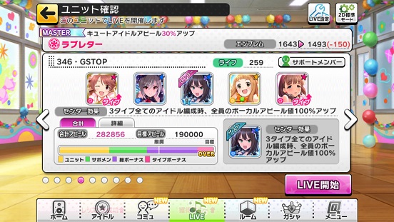 キュートばかりは理想ユニットがどうしても組めないのでこうなってしまう。トリコロールでカバー。理想はキュートのSSRユニットで行くことが最も望ましいのだが…でも以前は80万あれば大体銅トロフィー取れたのだが。絶対特権なんて75万程度でも取れたんだがな。