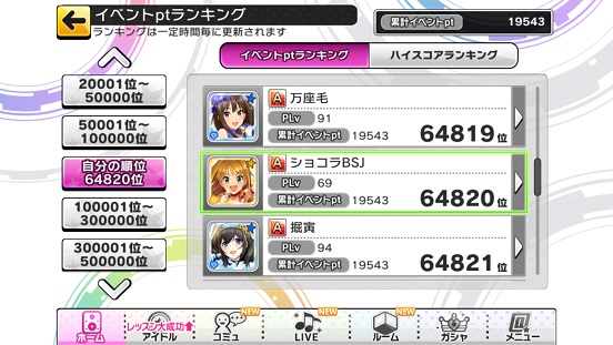 グルーブ系で気を付けたのはとにかく体力が50になったら起動してMASTERを回すこと!普通の時間ならいいが土日なんて15時30分くらい、ゲーセンでボーナススピンぶん回している時やパチンコX JAPANしている時でさえ体力50になったから決定ボタンだけ即押したりとデレステのことを極力忘れたりしなかったな。