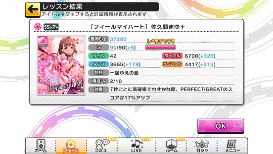 当然レベルも即90にする。ボーカル6700って異常じゃねえか!現実の歌手でいえば美空ひばりとかsuperflyとかロニー・ジェイムス・ディオとかそんなクラスの歌唱力だろ!!!現実のアイドルで上手いやつはいないか。基本アイドルって歌唱力は2の次だしな。まゆみたいなアイドルが出ることを祈る。