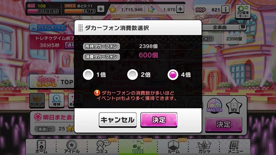 結局20:30に出る。つまりこの時点で残り30分。そしてここからいつもと大幅に予定を変えジョイフルに向かいついたときは残り20分程度だった。いきなりデレステをするわけにもいかないので注文してからプレイ。この時残り15分程度。この15分で一気にプレイしてなんとか体力もダカーフォンを消費して無事に終了。