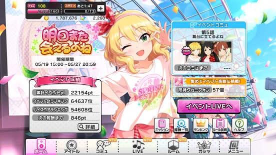 終わる直前の状況だがイベントポイントは余裕だが、ハイスコアが54608位…ちなみに最高得点は76万程度。いつもならギリギリ入れるかなあという程度だが、今回はかすりもせず。