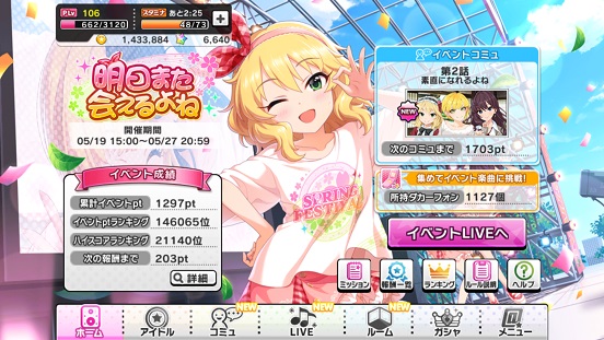 イベント「明日また会えるよね」開始。順位は結構低い。特にイベントpt。だって残業が多かったし…ハイスコアの方だけど、