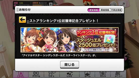 なんとホントにもらえたwどうもストアランキングで1位を取ったから2500もらえたということ。おそらく前の有償ジュエル2500でのスカウトガシャが絶対影響しているんだろうなあ。私もスカウトガシャだけはしましたもん。無課金だったけど。5000円課金したよ。