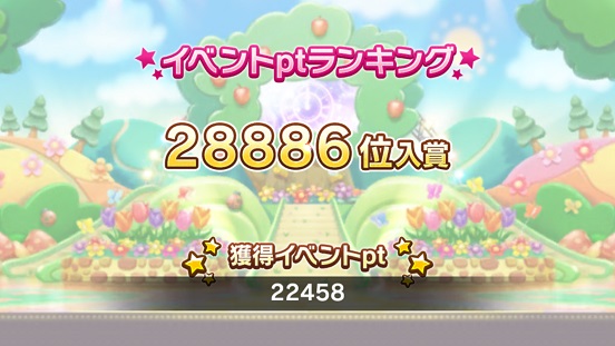 今回は イベントポイント28886位・ハイスコアランキング28553位とどちらも28000位台という珍しい結果に。ハイスコアは81万。イベントポイントは最高記録になったが、ハイスコアは前回よりも1万位くらい下がった。それでも銅トロフィーは獲得できてはいるけど。