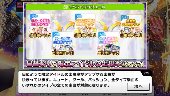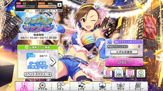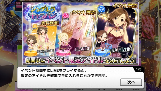 再びキャラバン。聖來(強SR)クラリス(弱SR)芽衣子(R)が目玉。期間は前回より1日短い。そして他のRもかなりの確率で出るようになるので特技アップをしたい人はめいっぱい走るべき!