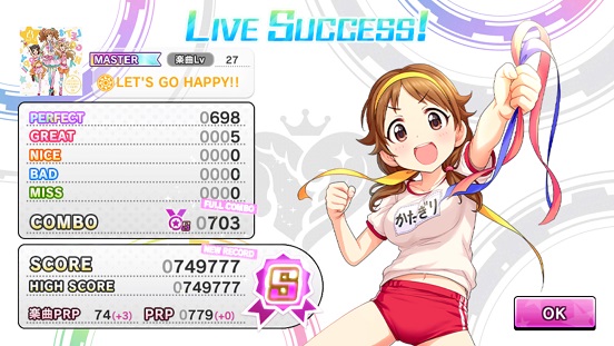 は3枚ドロップ。スターランクは15。スコアもS。確率アップ曲のみ。しかし、聖來はまだ0。キャラバンは確率との戦いなので頑張りたいところ。レアは結構出てきたが…