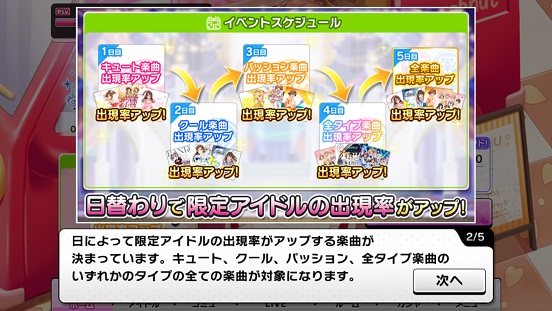 全楽曲と全楽曲が追加されて6日目からまたキュートに戻って最終日がパッション