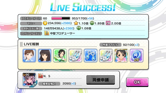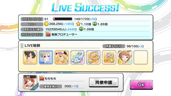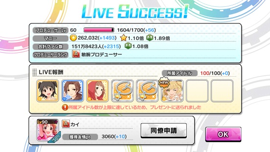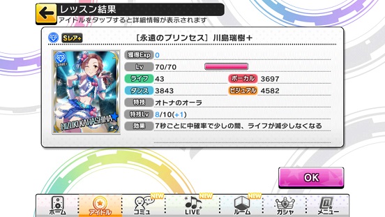 キャラバンで手に入れた被りレアアイドル11人程度ぶち込み、成功率90%程度で成功し川島さん特技レベル8。カンストまであと2つ。