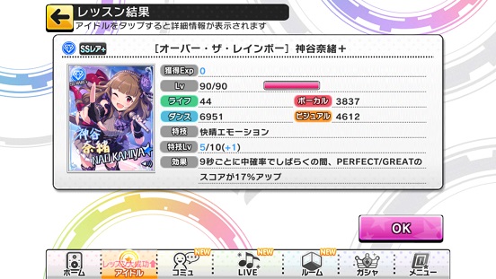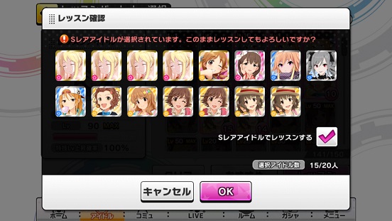 SSRのレッスンにも使えた。しかし、特技レベル5でも結構使う。正直Rのみで上げるのは限界があるかな?SRも大量にないと厳しい…19人使ってやっと100%。