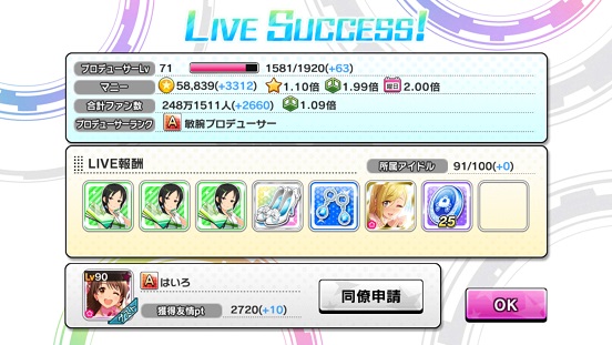私は基本的に同僚に特にこだわりがないので申請順にガンガン承認ボタン押していきます。N・R・SRアイドルがセンターでも全然おk。