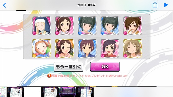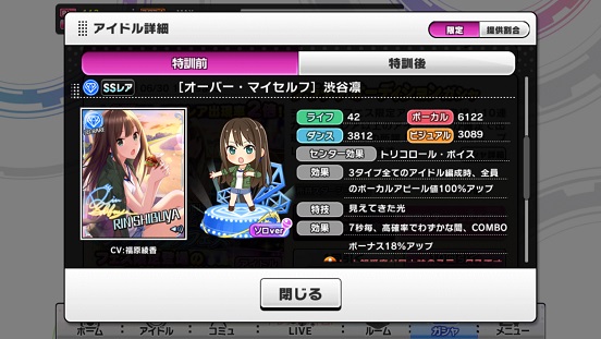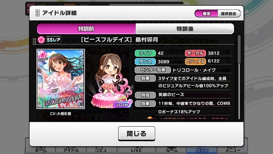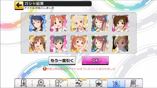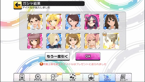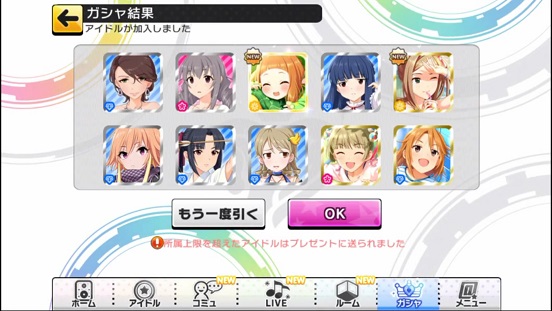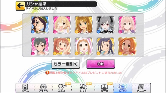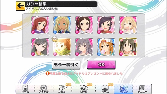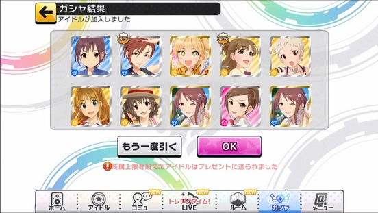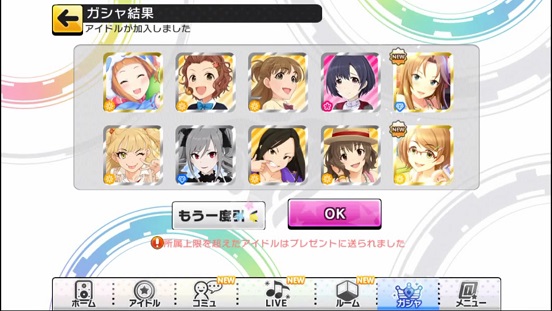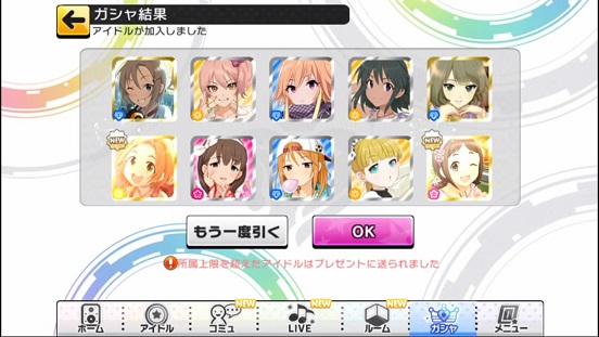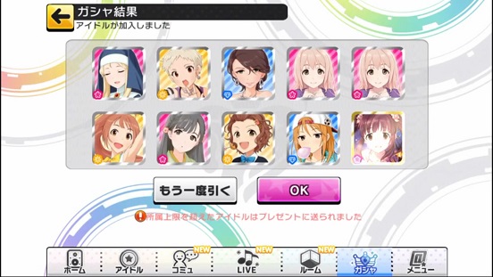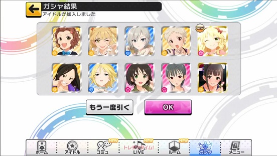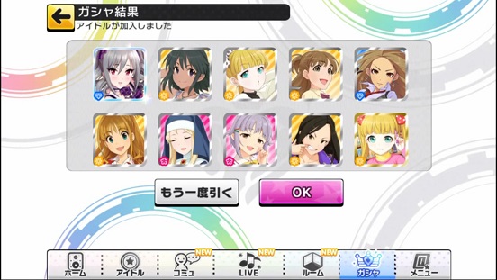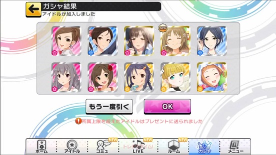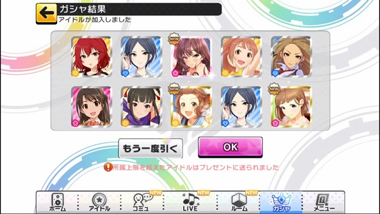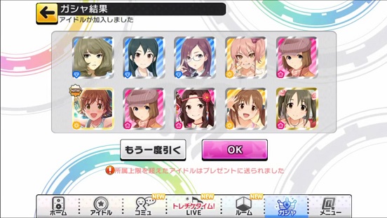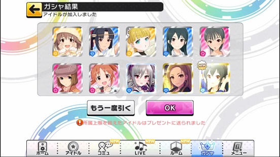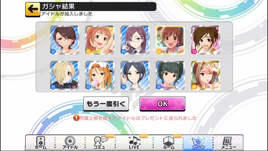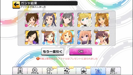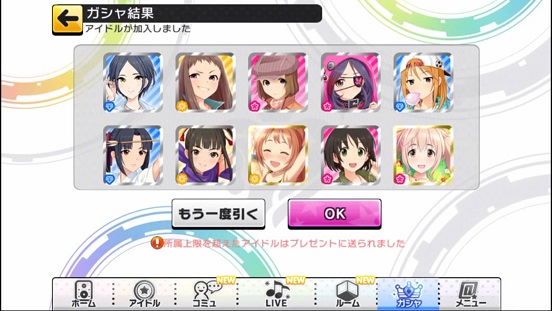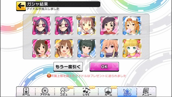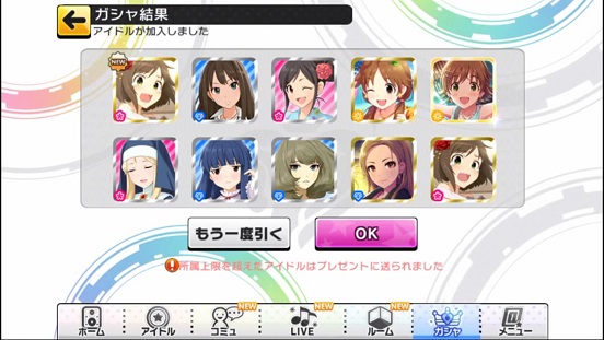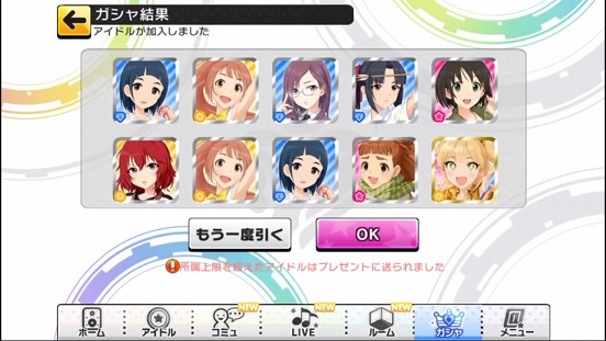 一応こんな感じになった。まあSSRは期待値以上に出現したのでいい感じだろう。しかしちゃんみお3人被っているのと蘭子の2被りはきつい。でも期待値以上に出たからおk。しかし限定しまむーは残念ながらスカウトできなかったが、仕方ないか。恒常は来たけどw