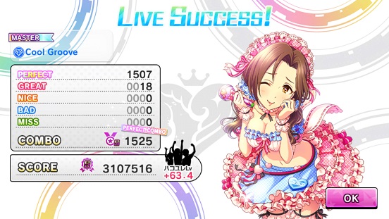 どうも3曲連続フルコンすると「PERFECTCOMBO」の表示が出てくるっぽい。つまり、1つでもnice以下が出るとAランクになってしまう。非常に困難だがデレステ初めて約5か月目で達成。