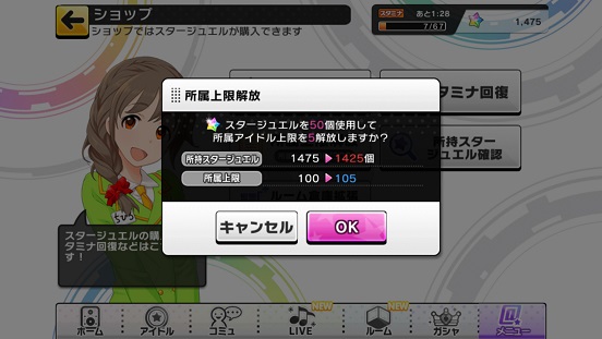 アイドルの上限を1.5倍の150に。これなら当分いっぱいにならない。現在90人も所属中。