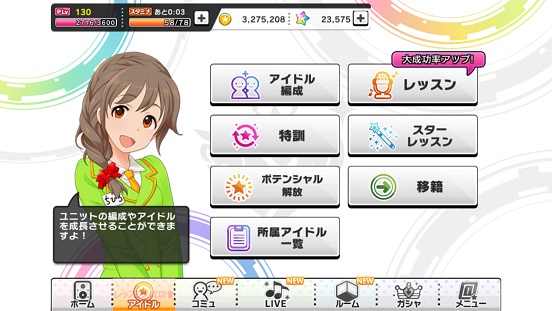 アイドルについては200くらいいる(実装されていないアイドル含んで)。まあ200もいれば必ず好きなアイドルが見つかると思う。担当アイドルがいるといないのではモチベーションが全然違う。