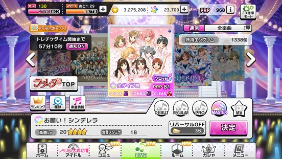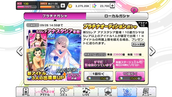音ゲーそのものの次、でも人によってはこれが一番重要というか?ガシャ。まあソーシャルゲー全般に言えるが、ガシャの売り上げがそのまま会社の売り上げにもなるので非常に重要な部分である。でもデレステの場合はアイドルものというだけあってCDやDVDの売り上げもあるのでガシャのみ重要ってわけじゃないが。