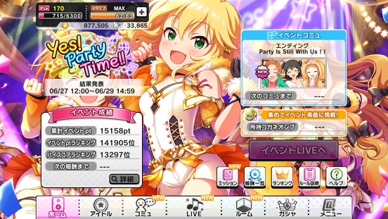 イベントは土日時間なかった。いつアタポンの報酬に美嘉とか来るんだ?その時は65536pt行きたいが。次のグルーブ小梅だってさ。別に構わないが小梅のSR多くないか?他の子にして欲しかったなあ。まあ今回の桃華も明日また以来2回目だし偏るなあ。