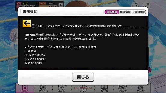 SSR通常3%になるんだって。地味にSRも12%か。じゃあフェスはSSR6%ってことか。個人的にこれはありがたい。極度の爆死も減るからいいと思う。爆死引退なんてかなり聞くしあとは天井か。これは無理そうだが。でもピックアップ上がらないとあまり意味がない。5月末のブライダルはこいつの布石か。