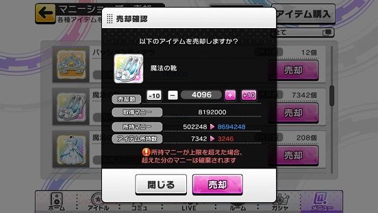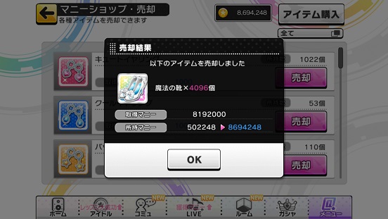 まず親愛度を上げるアイテムが足りないと思う。それとマスタートレーナー等欲しいものが結構あったので買う資金を手に入れるためにここでたまりにたまった靴を一気に4096個売却!売却額8192000円。8ミリオン。上4ケタもGOD数と美しい数。