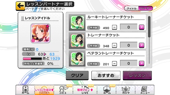 親愛度200になったら特訓する。そこからレベルを1から90に上げるちょうど大成功率が3倍なので今しかない!SSRについてはレベルを全員90にした。