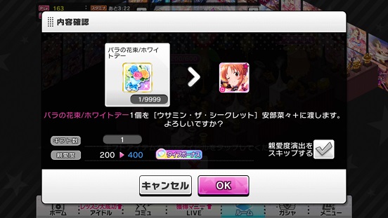 渡した結果全部なくなった。SRは1人残して特訓後にすることができた。対象アイドルは9人ぐらいいたはず。親愛度についてはSRの場合特に最大にしていない。まあ主力はSSRだしねえ…SRまでしか参加できないようなイベントがあれば別だが。現状ないので親愛度をMAXにするのはSSRとコンボSRくらいかなあ。